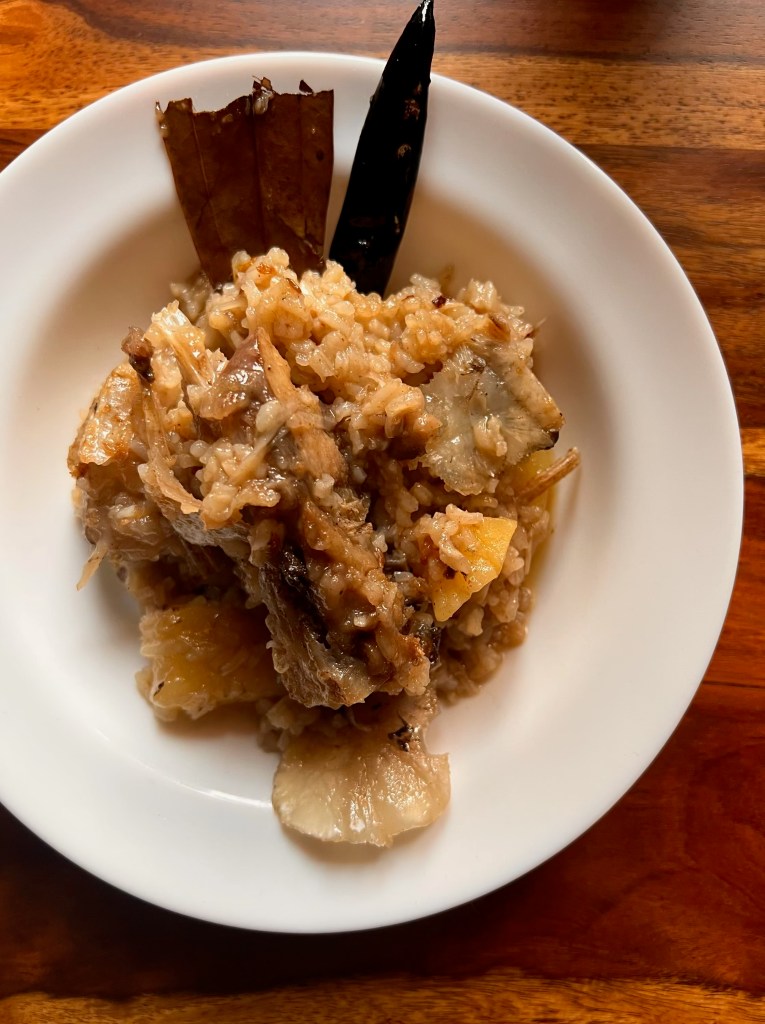 When the rice is halfway cooked, I bring back the fried fish head. I place it gently, almost ceremoniously, into the pot. Then, with the back of my ladle, I break it. It doesn’t resist. It yields the way things do when they’re meant to belong.