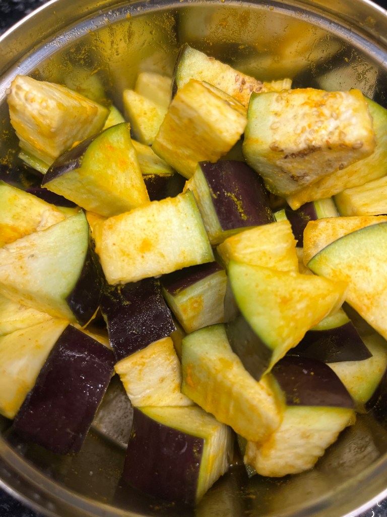 Heat a neutral, fragrance-free white oil in a pan. Once warm, add in the brinjal pieces. Fry them the way you would until they are soft, lightly golden at the edges, but still holding themselves together. (I usually cover the pan while frying to ensure less oil consumption.) Remove and set aside. In the remaining oil, begin building the flavour.