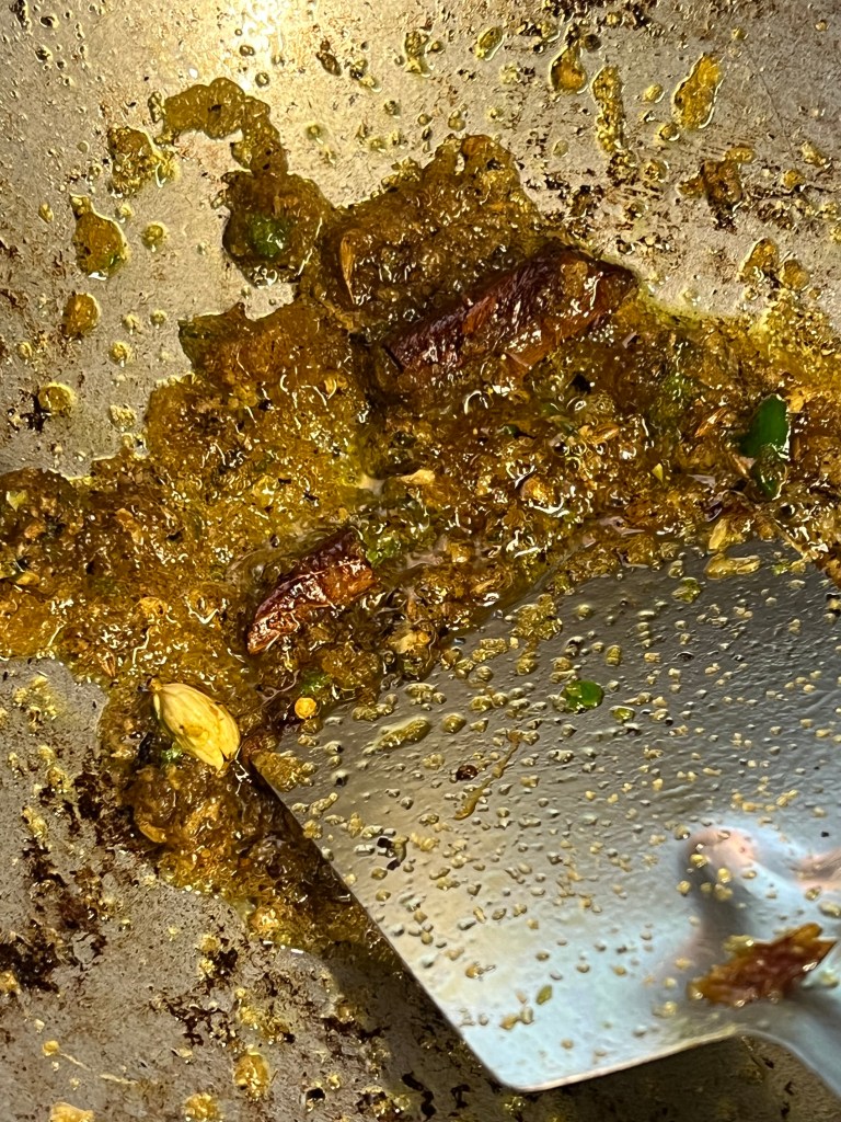 Add a small stick of cinnamon, one tiny green cardamom, and a dash of jeera. Let them temper gently as the aroma should be warm, not aggressive. Then add ginger paste and chilli paste, followed by a bit of ground jeera (homemade if you have it, but any will do). Let this mixture cook until the raw smell disappears and your kitchen begins to smell like something is happening. This is your base. Take a moment here, don’t rush it.